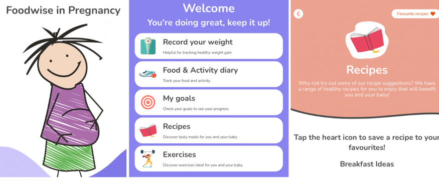 The App called Foodwise in Pregnancy, includes six sections to work through at your own pace with recipes, shopping tips and a meal planner, as well as step-by-step exercises ideal for pregnancy. The App also allows people to set goals throughout their pregnancy, record food and exercise activity, and includes interactive games, quizzes, and tools.