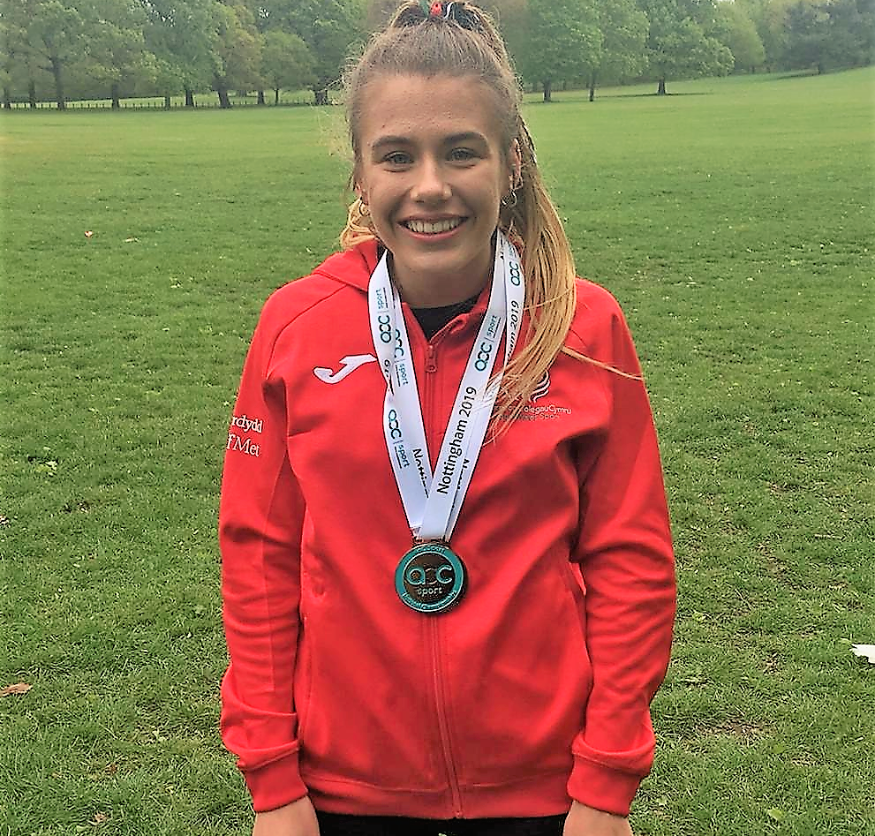 Holly Roberts who studies at Coleg Cambria achieved bronze in the cross-country event at the AoC Sport National Championships in Nottingham.