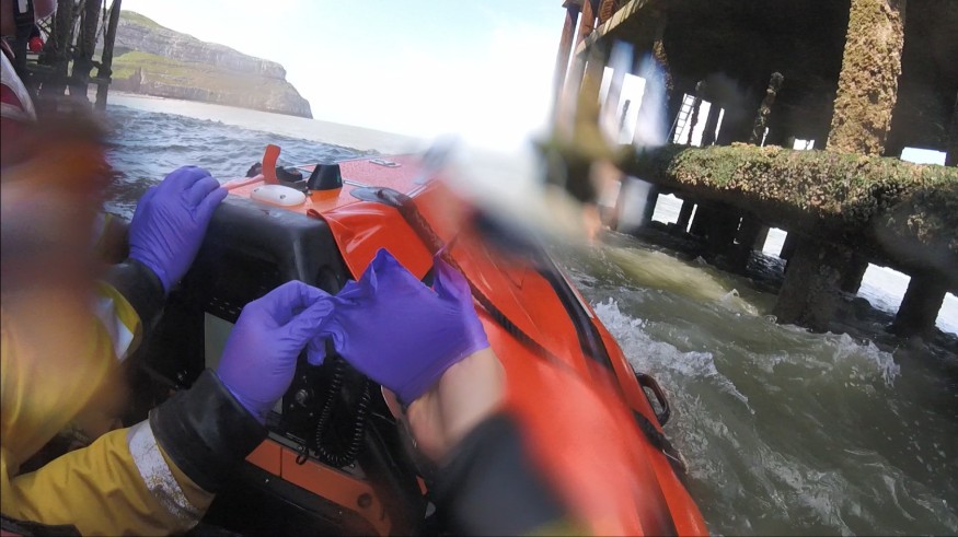 Despite rough conditions, the inshore lifeboat quickly located the casualty clinging to a pier support covered in barnacles.