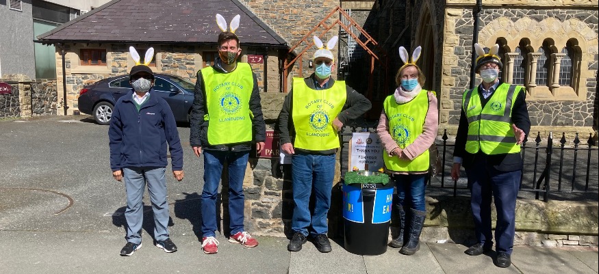 COVID has thwarted fundraising for much of the past year, but Llandudno Rotary has taken to the streets again and eight Rotarians, disguised as Easter Bunnies stepped into action to relieve the towns people of some of their cash for Ty Gobaith.