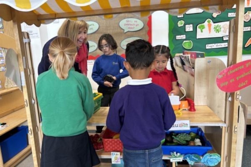 The Cabinet Secretary recently visited Ysgol Gynradd Groes Wen, where she met Guadalupe, aged 5. Her family moved from Colombia during the Summer Term and she has attended the Language Immersion Unit since early September. Settling in well and enjoying practising speaking Welsh in the role-playing area.