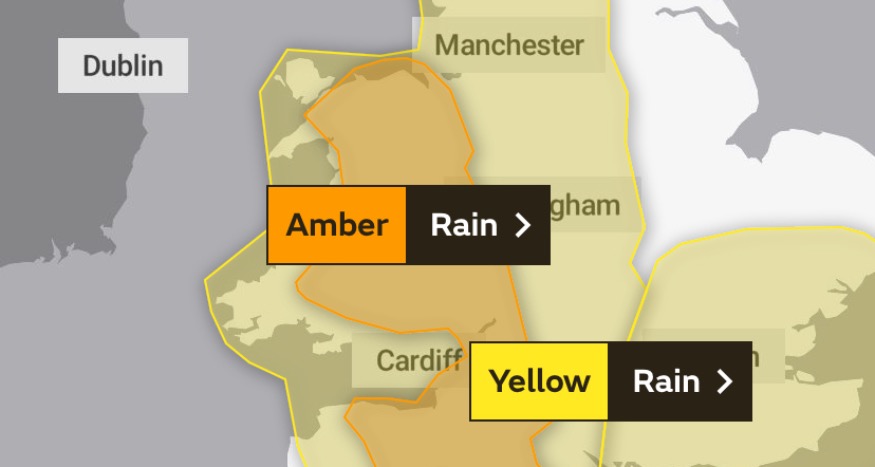 The Met Office has issued an amber warning for the whole of Wales and a yellow rain warning for parts of North West England. An amber warning describes flood conditions which could 'cause danger to life'.