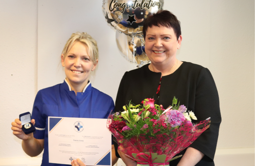 On behalf of Ms Tranka, Angela Wood, Executive Director of Nursing for BCUHB, presented Stacey a CNO Excellence badge, certificate and flowers for her efforts working with and supporting care home staff gaining her their respect and trust.