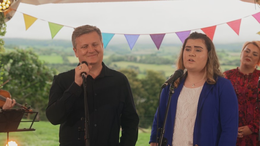 The intimate performance sees Efa and Aled singing to a small gathering of family, friends and hospice supporters.
